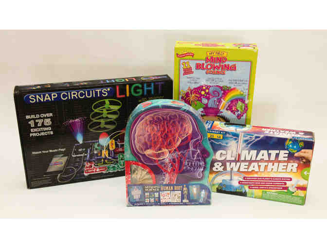 Unplug, build and create! This set of 4 science toys are suitable for the whole family. Items included are: Snap Circuits Light, Climate & Weather Experiment Kit, Adventures in Science; The Human Body, My First Mind Blowing Science Kit.