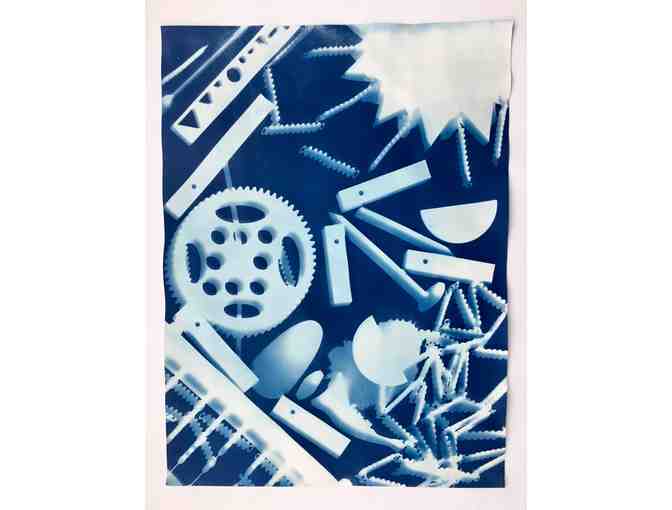 Students learned in class about Anna Atkins and the cyanotype process she used for documenting botanical specimens. On a cultural front there is renewed interest in the beautiful work of Ms. Atkins, as well as the fact that she is considered the first person to ever publish a book of photographic images, which she did in 1843. Cyanotypes were one of the earliest photographic processes and involve coating paper with light sensitive chemicals, placing objects on top of the paper, exposing the paper to sunlight, and then processing the resulting print in water, thereby transforming the image to a permanently vibrant blue. While engaging in the cyanotype process Redwood students were both artists and scientists, trying out this hands-on mode of image making individually on a small scale and then working in three collaborative teams to create large 18” by 24” prints, which are matted and displayed in 22” by 28” natural wood frames. The groups followed three different themes: Classroom Materials, Botanical Specimens, and Food. Each team took care to work together on every step of the project, including selecting materials, creating visually strong compositions, exposing their creations to sunlight, and processing the prints in water. New discoveries were made by the young artists/scientists, such as that acid from citrus fruit created new colors in the food themed print. Redwood students were delighted by the magical experience of seeing their images chemically transform. We hope that you will enjoy their beautiful works of art!