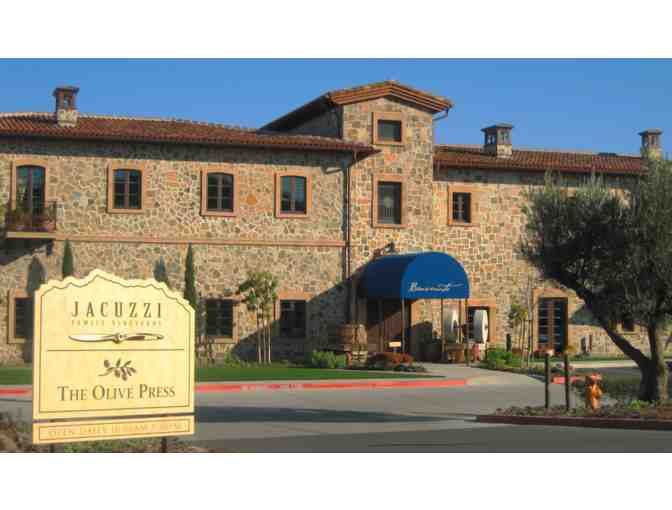 Winner will enjoy a VIP Tour and Tasting for four at the Jacuzzi Family Vineyards and The Olive Press located in beautiful Sonoma, California. Winner will also receive a complimentary cheese plate and a 15% discount on all wine purchases.