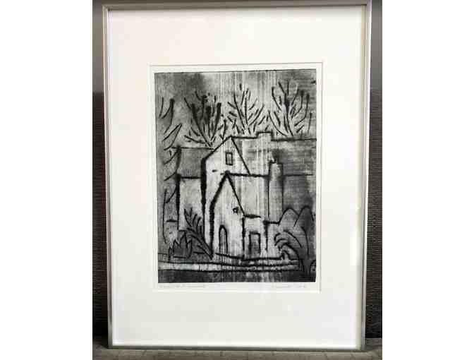 Beguinage, Brugge is a wood drypoint engraving on Whatman paper of this peaceful convent. A beguinage, from the French term béguinage, is an architectural complex which was created to house beguines: lay religious women who lived in a community without taking vows or retiring from the world. This piece exudes calm and contemplation. It was printed and framed by the artist, Bobby Donovan. Mr. Donovan is a highly regarded artist whose work is in numerous public and private collections including the National Gallery of Art, The Smithsonian American Art Museum, and The Baltimore Museum of Art, among others. The etching is matted in a chrome frame and measures 24" X 18".