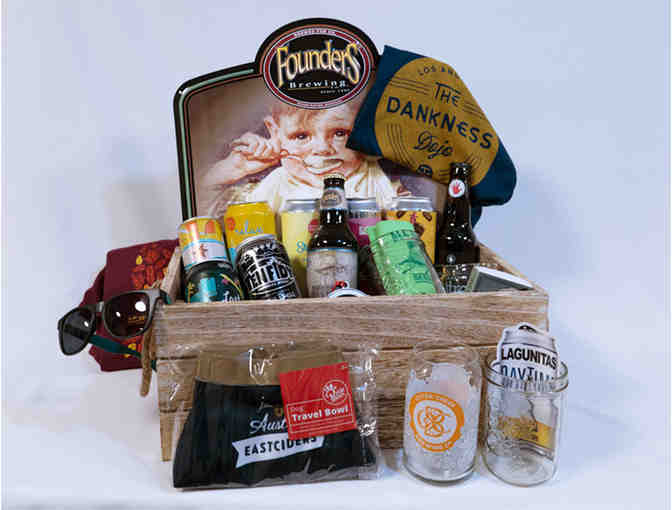 Lift a glass and party on with the yummy contents of this craft beer treat. Bottles and cans of some of your favorites, a tin sign, four glasses, woman's t-shirt, men's cranberry long-sleeved t-shirt, matches, travel dog bowl, sunglasses, koozies, and a wonderful reusable wooden crate.