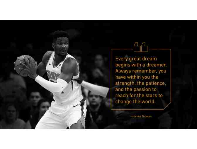 Custom, autographed black & white Deandre Ayton 18" x 24" canvas accompanied by a quote from Harriet Tubman, reading, "Every great dream begins with a dreamer. Always remember, you have within you the strength, the patience, and the passion to reach for the stars to change the world."
