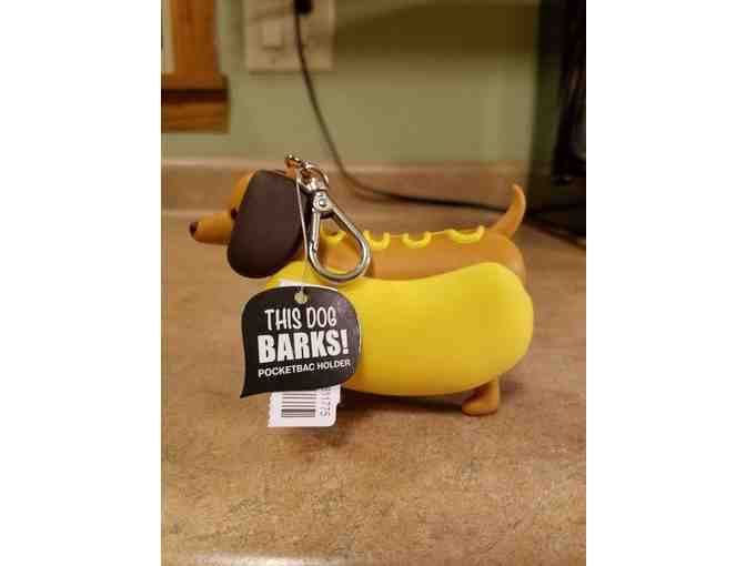 From Bath and Bodyworks, a Dachshund hand sanitizer dispenser (complete with hand sanitizer) that BARKS!!!! The dachshund is in a hotdog costume, and barks when his middle is pressed. It is the cutest thing ever! Has a clasp to attach to your bookbag or your handbag.