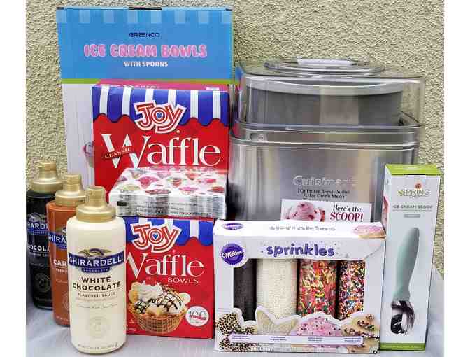 This classroom basket includes a Cuisiart 2Qt Yogurt-Sorbet and Ice Cream Maker, Ice Cream Scoop, Sprinkles, edible waffle cones and bowls, Ghirardelli syrups, ice cream napkins, Ice Cream serving bowls and spoons.