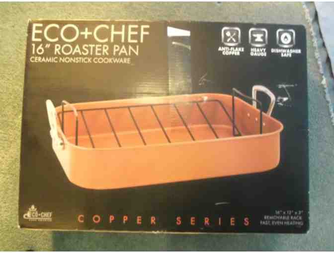 Eco+Chef 16" Roaster Pan perfect for oven roasting meat, poultry, & vegetables or for baking lasagna and casseroles. Ceramic Nonstick coating for easy cleaning; cook healthy without butter, oils & chemicals. Heat resistant up to 450 degree F; Oversized heavy duty aluminum looped handles; V shaped removable rack 16"x12"x3" Also comes with Eco Chef Electric handheld Carving knife Handy blade eject button with safety guard to prevent accidental release; serrated stainless steel blade carves meat or bread; easy to use trigger control; 110 watts