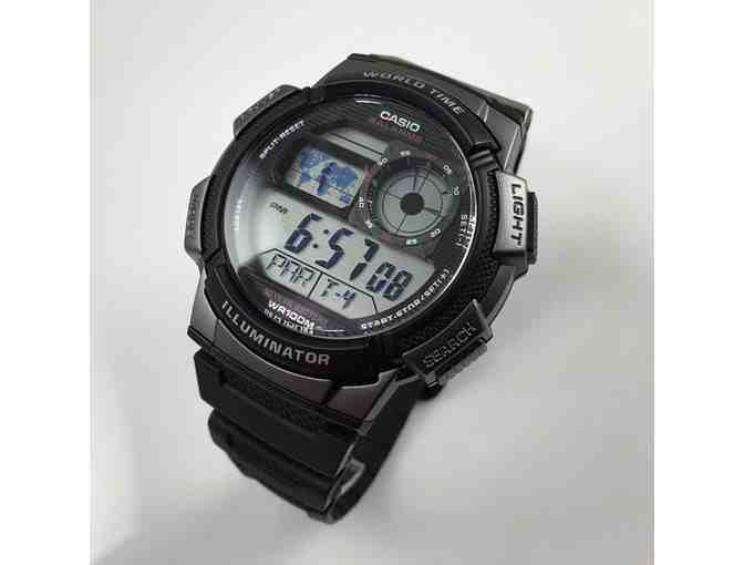 Keep track of the time with the attractive multi-function Casio Men's Digital Sport Watch. This modern timepiece features a black dial that allows you to see time in both analog and digital formats. Suitable for both casual or work attire, it offers numerous exciting features, such as a large digital face, five alarm settings and a calendar. In addition to being practical, this Casio digital sport watch is eye-catching. For the serious athlete in you, its wide face features a stopwatch and countdown timer so you can time your runs, bike times or laps accurately. Additionally, this men's sport watch is water resistant and can go as deep as 100 meters. It has a world map time zone display that tells you the exact time in many cities across the world. The band is crafted from resin, ensuring extended durability. With its attractive appearance and abundance of useful functions, the Casio Men's Digital Sport Watch is an excellent choice. Casio Men's Digital Sport Watch: