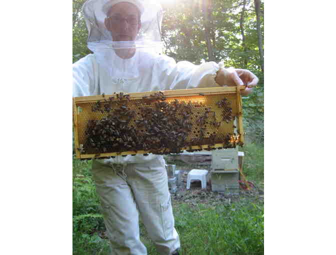 A deluxe gift bag from Beacon Bee, containing; a pair of handrolled beeswax taper candles, a tin of Everything Balm, all natural Tick Stick, a jar of Beacon Bee honey, a packet of wildflower seeds and a pack of notecards