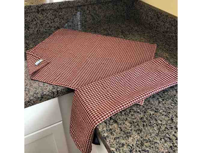 Two, 17" x 22" maroon and ivory dish towel. 100% cotton. Hand-woven by local Kennebunk crafter and volunteer Lynn McCarthy.