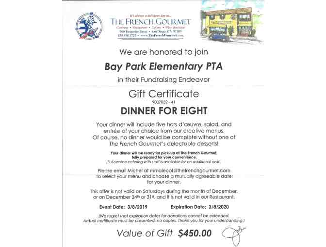 Dinner for eight which will be fully prepared and ready for pick up at The French Gourmet. You will be able to select five items from their creative and delicious menu. Full-service catering available at an additional cost and the date must be mutually agreed upon and can not include Saturdays during the month of December or on December 24th and 25th.