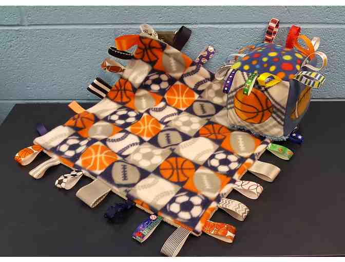 Sports-themed tabby blanket & rattle donated by Barb Messenger