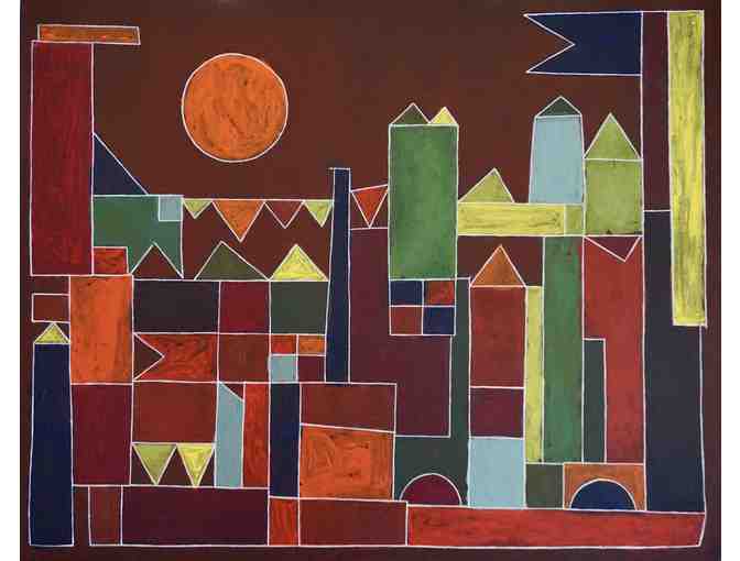 "Kinder Klee" student interpretation of Castle and Sun by Paul Klee. Students first cut shapes of colored paper and taped them to a poster board. We then projected that onto a canvas. The students then painted the shapes in selected color palette. 30" x 24" canvas.
