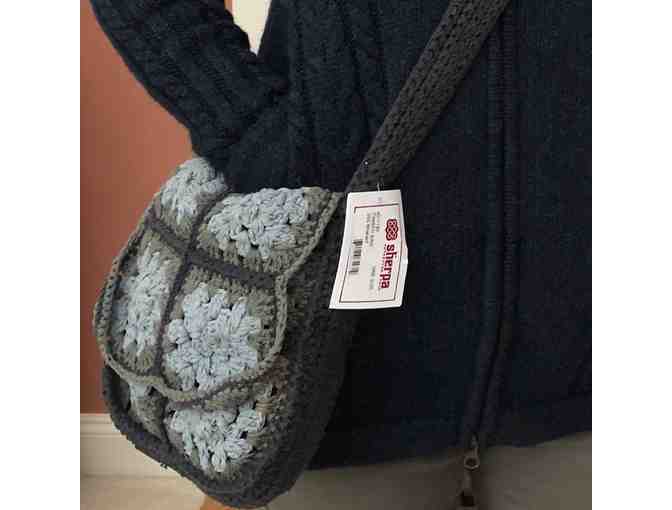 Sherpa Gear Timbeh Bag, handcrafted in Nepal. Shades of blue, Zipper closure with additional inside zipper pocket.