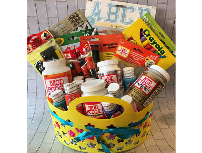 70+ Pieces. Including 1 Large Mod Podge, 3 Glitter Mod Podge, 12 Kids Craft Paints, Fabric Markers, Markers, 3 sets of Poster Stencils, Faux Resin, Paintbrushes and More.