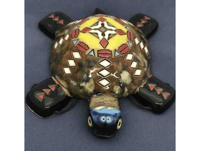 This piece is a 5" diameter turtle that reflects The Four Directions. The artist describes The Four Directions: "Also a symbol for the Earth, seen on maps and compasses. I was taught that this simple symbol reflects the Elements, Earth's Law of Balance and our personal quest for balance. For me the East is Fire and Light and our Spirit. West...Substance, the Physical, ground, the stones, our bones, our Body. South...Water, flowing motion, our Heart, Emotions. North, the Air, WindSky, Reasoning, Knowledge and Wisdom, our Mind. When we stand at the Center of the Four-Directions, balanced Spirits, Bodies, Hearts and Minds, knowing the natural elements are within each of us, we can truly stand with Life, making choices for the good of Self, family and all beings in our world."