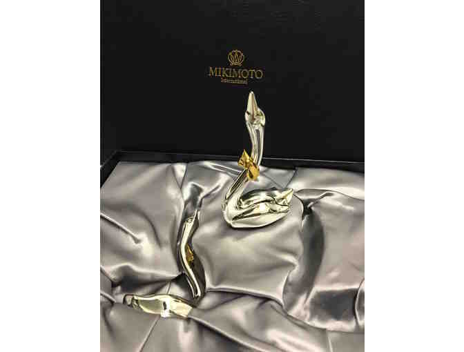 A pair of Mikimoto decorative silver swans with gold bowties. Each swan has a slot in the back for holding a business card or photo. These beauties are perfect for business or home offices.