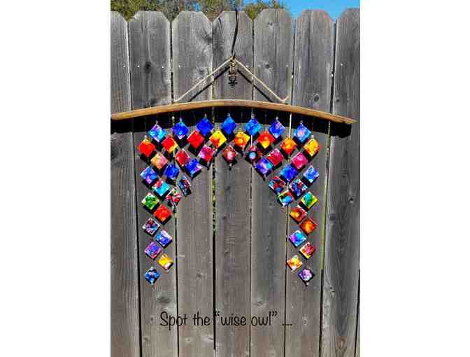 Mrs. Thorsen’s Wise Owls unleashed their creativity, each decorating 2 ceramic tiles with colorful alcohol ink. The tiles have been lovingly strung together, along with glass bead accents, to create this eye catching, one-of-a-kind piece of art! The wires are connected to a rustic wine barrel slat with both the wood and tiles ready to be hung either in your home or as a wonderful addition to your garden…it’s sure to be a conversation piece!