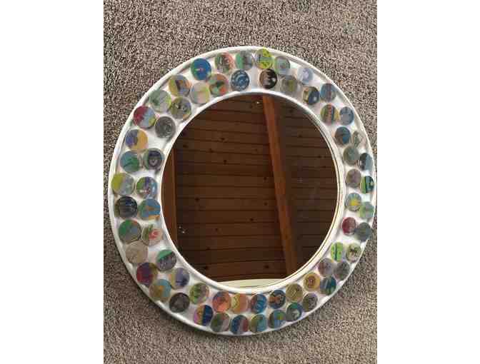 Mrs. McCaffrey’s 5th grade students got in touch with nature when they designed this mosaic mirror. Each student designed a piece of wood with a unique nature scene, some of which remind them of their 5th grade camp experience. The students then attached the ‘tiles’ to the mirror themselves. The mirror is approximately 22” in size and is ready to hang. Perfect for an entryway or hallway!