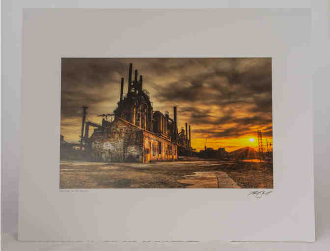 This vintage color photograph by Michael Sandy reveals, in glowing yellow/orange, a sunrise in the yard of an old industrial site. Gray clouds and the natural stone walls of the old, deserted factory building, with its boarded-up doors, old windows, and multitude of smoke stacks and iron works bring to mind an era long past. Anyone who grew up near the factories of a former age would be charmed by the familiar architecture like this. It may be long gone, but it is certainly not forgotten. The 9x14 photo is matted in white and comes to 16x20, ready to frame and hang in your home or office.