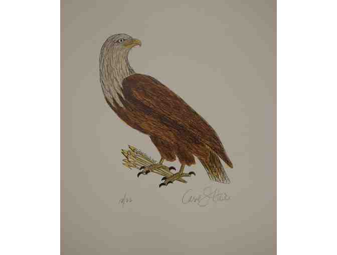 Perched on eight gold arrows, this magnificent symbol of our country is brought to life in watercolors, white, brown, and gold, on 10"x12" white foam board. Signed by the artist, Carol Haile, this life-like bald eagle is ready to frame and hang in your home.