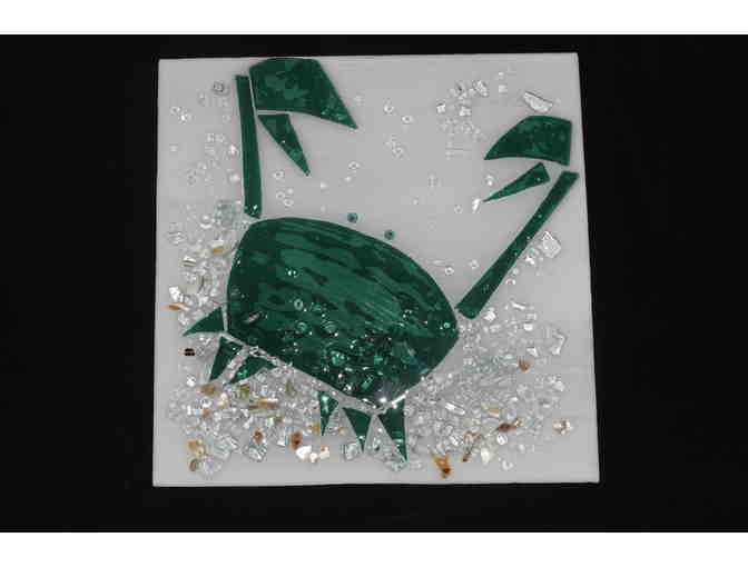 A 12"x12" inch white background is “washed” with melted clear and crushed colored glass to form a green crab with millefiore eyes and large green pincers. Chunks of clear- and sand-colored glass are encased in the melted glass to look and feel like pebbles and sand under water. This gives a three-dimensional, true-to-life effect of a green crab crawling through water at the edge of a beach. Though it comes ready to hang, everyone will want to touch this piece of art before it goes on the wall.