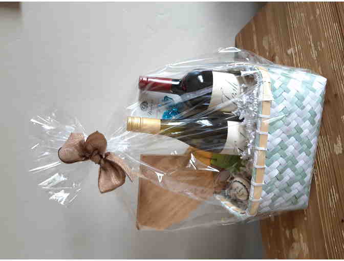 A gift basket including a bottle of Josh Cellars Legacy Red Blend vintage 2016 and Josh Cellars Chardonnay vintage 2017, a California Bamboo Board by Omni Butcher Blocks and made locally in San Diego, A byDesign "Here's to Girl's Gone Wine" bottle topper, and a $50 Gift Card to Water's Catering!
