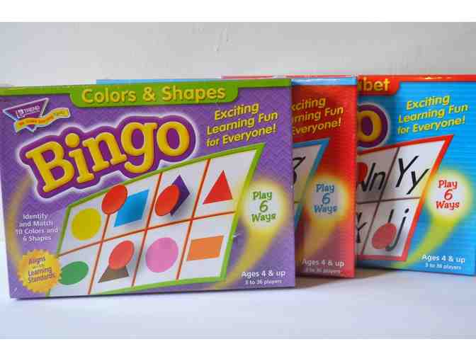Exciting learning for everyone! Identify and match shapes, numerals and letters with these three separate Bingo games. Each set comes with 36 playing cards, calling cards, calling mat and bingo chips.