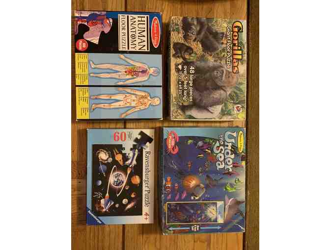 This set of four puzzles includes: Human Anatomy 100 Piece Floor Puzzle by Melissa & Doug; Under the Sea 100 Piece Floor Puzzle by Melissa & Doug; Gorillas Giant 48 Piece Floor Puzzle; Ravensburger In the Galaxy 60 Piece Puzzle. All of the puzzles are used and in good condition. All four puzzles have been checked and all pieces are included.