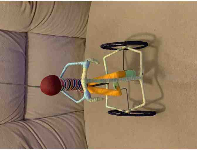 In Africa, homemade galimotos are fashioned by children out of anything from sticks to cornstalks, and can be vehicles of any sort. This ingeniously crafted galimoto push-toy bicycle rider is created from shaped wire wrapped around fabric by artisans of the Chuma Wires workshop based in the Dandora area of Nairobi, Kenya. Chuma Wires provides valuable work for artisans who have little or no other opportunities for employment in this marginal section of Kenyas sprawling capital.