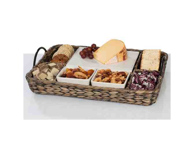 Make entertainment easy with this Island Breeze Hostess Server. Includes natural hand woven basket, removeable stoneware cheese cutting surface and two washable dishes for dips, four open compartments for crackers and snacks, and sturdy metal handles for easy portability.