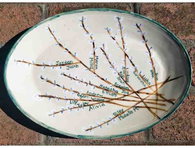 Ms. Maeder's Second Grade class, the "Superheroes" made a food-safe serving platter with a personalized pussywillow design. On one side of a stem each student made several fingerprints to mark each pussywillow bud. Students painted on the underglaze using their fingers! The back of the platter commemorates each student in the class with their original signature. Stoneware design features colors of pale green, forest green, chocolate brown, and white. Use this fun serving dish as a conversation starter on special occasions or for everyday purposes! Oval platter measures 16"x11". This is a mid-fire stoneware (cone 6), so it is much more durable and food safe than most hand painted ceramics which are low-fire.