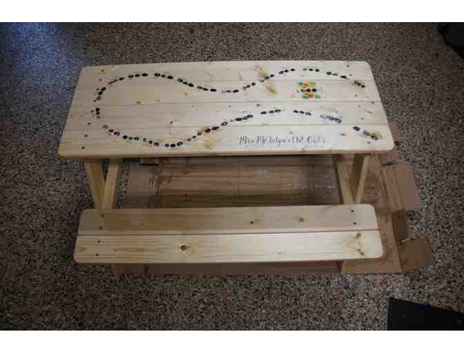 Up for bid is an adorable children's picnic table decorated by Mrs. McIntyre's D-2 Owls Kindergarten class! Enjoy picnics and playtime with your kiddos on this precious little picnic table. But beware of all the fingerprint ants, they might try to steal your snacks! Also included is a mini basket of goodies to plant in your garden, perfect for kids to grow and tend to!