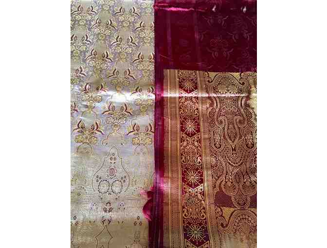 This exquisite silk brocade sari measures about 16' X 45". The fabric could also be used for a bedspread, curtains, wall hanging, or table covers. It is an amazing piece.