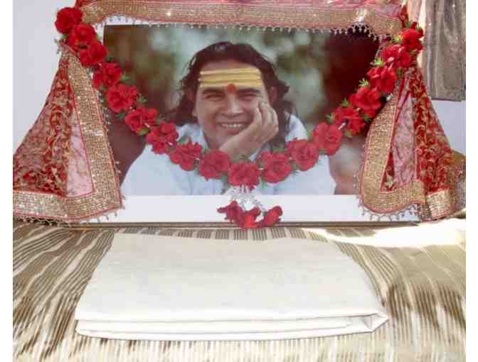 What a treasure we have been gifted from Shri Babaji through long-time devotee Ram Dass. This lunghi of Babaji's was given to us to grace our auction. The scent and energy is still so poignant. This incredible peice of silk measures about 96 inches by 44 inches and can used as an altar cloth, or worn for ceremonies or used as a shawl. To wrap yourself in the love and energy of Babaji is something sublime.