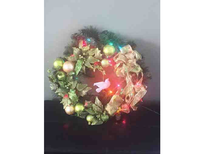 A beautiful hand-made wreath of ornaments and bows in your choice of colors.