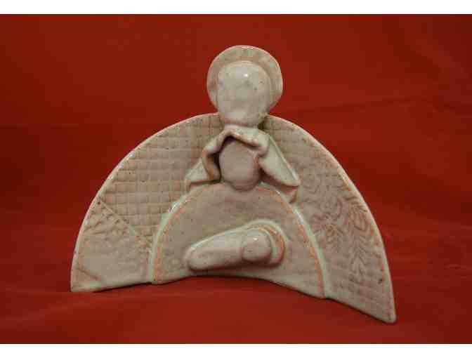 This handcrafted ceramic nativity scene is the perfect piece to add to your Christmas decorations or to leave up all year. Depicted in the scene is an angel surrounding a mother holding a baby. The warm earth tone colors of sage green accented by hints of brown evoke peaceful feelings. This item would be a welcome addition for a fireplace mantle.