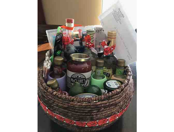 Donated by PHS Girls' Basketball, this Fiesta Party Basket contains silicone drinking cups, salsa, stuffed olives, drink umbrellas, a $25 gift certificate to bill and carols for 2 steaks and a pound of homemade salad, a “fiesta party box” (party decorations), a lime press, liquor pourers, (the actual alcohol), margarita salt, and tortilla chips.
