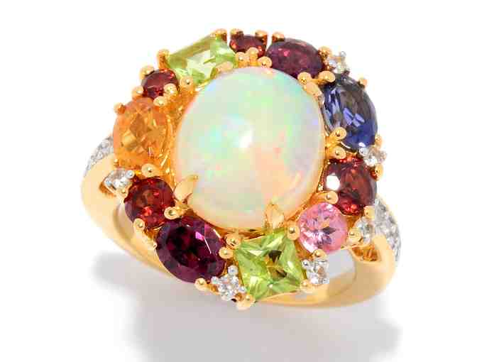 Multi Gemstone ring including Ethiopian Opal: 2.43ct, Citrine: 0.33ct, Iolite: 0.31ct, Rhodolite Garnet: 0.65ct, Garnet: 0.59ct, Peridot: 0.60ct, Tourmaline: 0.13ct, White Zircon: 0.23ct