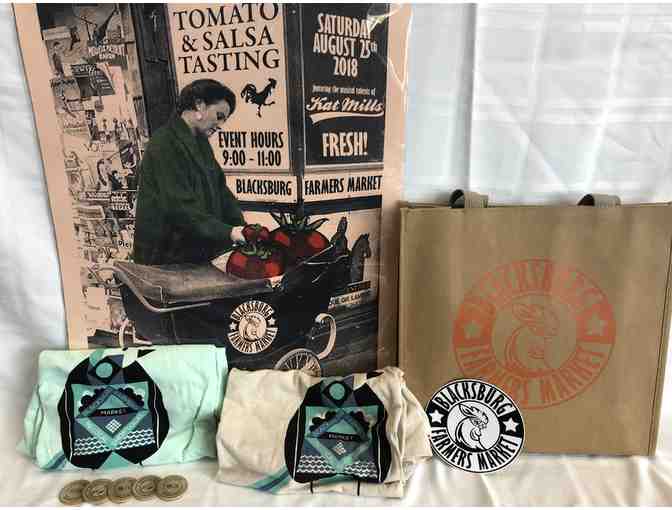 We love the Blacksburg Farmers Market! Check out all this great merchandise, including a tote bag, poster, two t-shirts, and sticker. Plus, receive $25 in BFM tokens to be used for any purchases with vendors at the market!