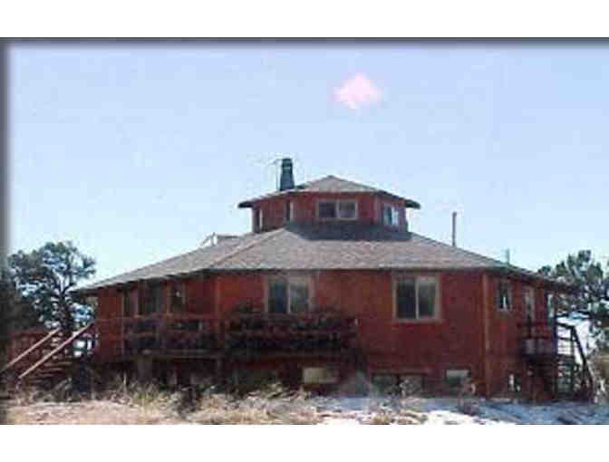 One night at the beautiful Rainbow Bed & Breakfast in Crestone. Tucked away in the foothills of the Sangre de Cristo Mountains, our quiet facility is an ideal environment for personal retreats and vacations. The hexagon shaped house, sits amid the pinon and pine trees. The bed & breakfast, on the first floor, has a full kitchen, guest lounge with stereo, TV, DVD, VCR, three bedrooms, two full bathrooms, solar radiant floor heating and wireless internet.