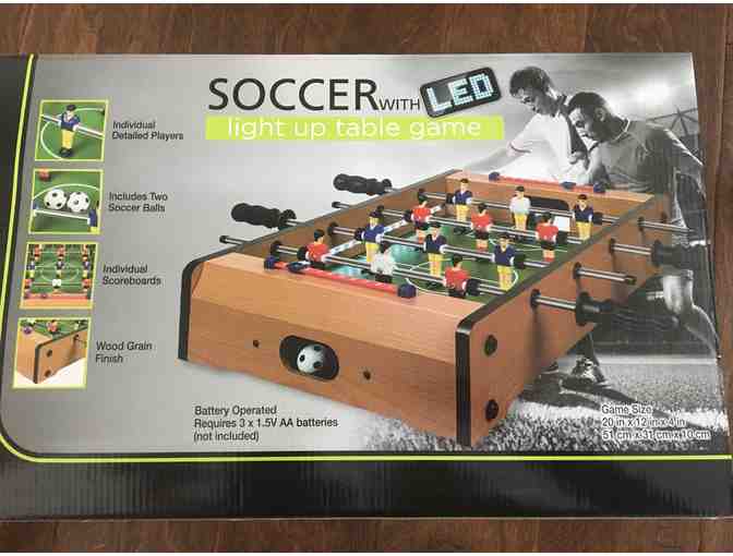 The Soccer with LED Light Up Table Game is a mini foosball table that will provide hours of fun for your whole family that fits easily in any space in your home. This includes individual detailed players, two soccer balls, individual scoreboards, wood grain finish. This is battery operated. Requires 3 1.5V AA batteries (not included).