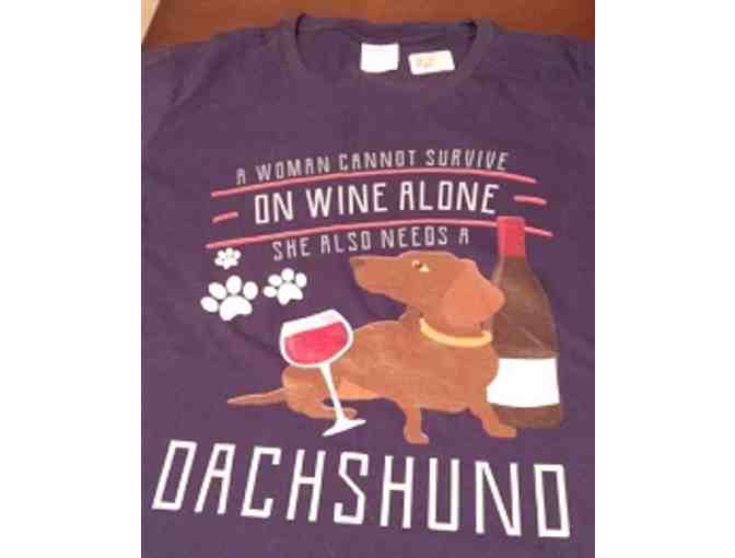 Navy womens T-shirt. Sized as large but runs more like a small/med. States A woman cannot survive on wine alone. She also needs a dauchshund. 100% cotton