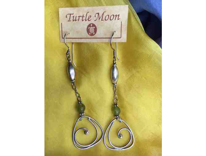 These beautiful "Turtle Moon" silver earrings feature a delicate green stone and are hand made by Sunridge teacher, Sasha Prosser.