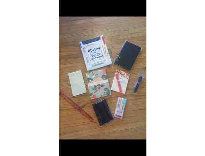 Creative Journaling Basket- Everything you need to begin creative or bullet journaling. Includes 3 notebooks, a note pad, a beginners guide to lettering, tracing templates, fine line markers, a packet of mildliners, a foldable ruler and a fountain pen.