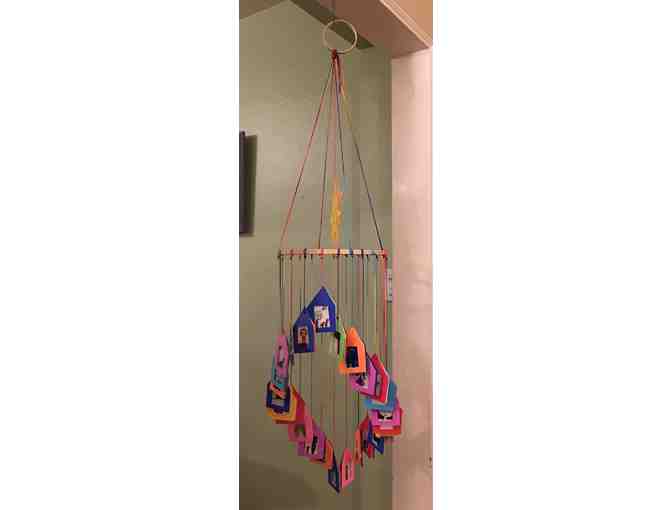 "Neighborhood" mobile (houses made of cardstock with shrinky dink window drawings by students -
