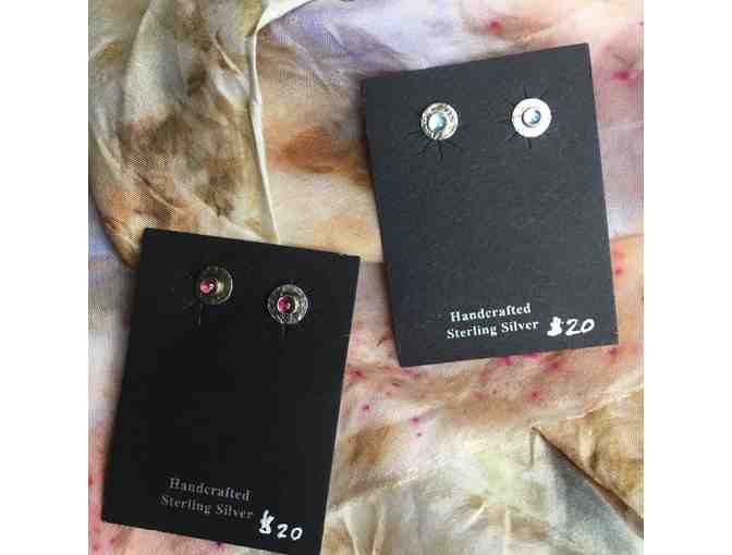 Delicate blue and rose stones set in a circle of sterling silver. Great for casual or dressy, or maybe for your Sunridge student! Handmade by Tiny Sparkle Studio.