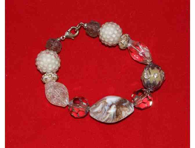 The warm, vanilla-white and sugared-colored beads of this bracelet are neutral enough to go with any outfit! Each bead is uniquely shaped and sized. The largest diamond-shaped, marbled bead measures 1 ¼ inches. Other beads include white snowball shaped, oblong clear crystal, round faceted silver, metallic spacers with gold crystals, and a cream enamel bead with crystals and silver embellishments. This unique bracelet is secured with a lobster-claw clasp and fits small and medium wrists up to 7 ½ inches.