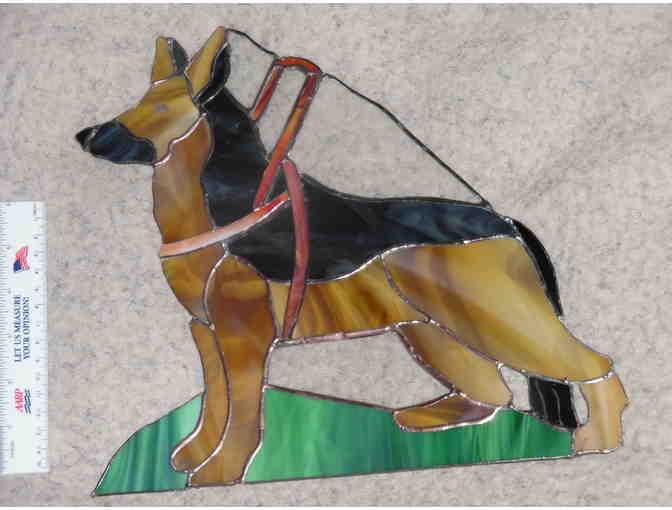 This beautiful, handmade piece of stained glass art would be a unique addition to any German shepherd lover's home. Made of warm golden brown and tan-colored tones, the glass pieces are creatively arranged into the shape of a standing shepherd, complete with a dark brown harness and green grass underfoot. It measures approximately 11" high by 11" long and would look stunning anywhere, but it is especially striking when placed near a window for the sun to shine through. Why not let this piece help brighten your home?