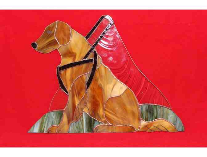 This beautiful golden retriever in harness is sitting perfectly upright, ready to give you his utmost attention. Made of colorful stained glass, this piece of artwork will capture attention no matter where it is placed. With lovely shades of tan for the dog and green for the grass, the colors pop even more when the sun shines through them. The artwork measures approximately 10" high and 12" long and takes the shape of the dog (not a full windowpane). Let this pup brighten your home!