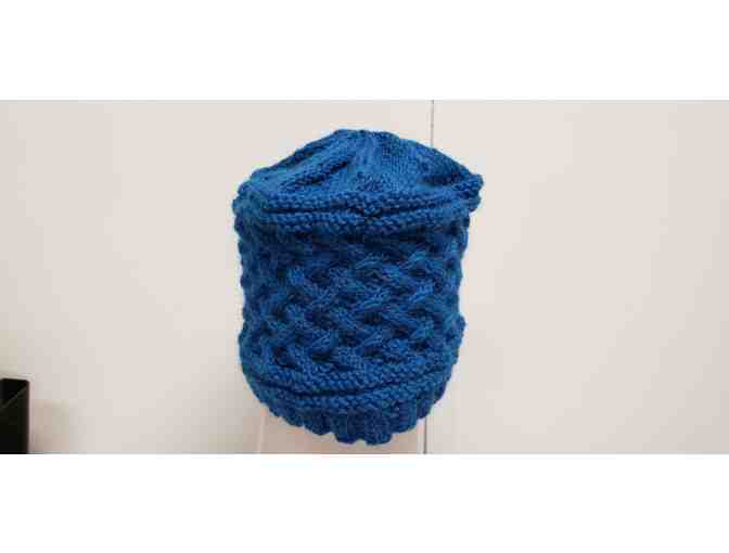 Blue hand-knitted hat will fit an adult with a 20" - 23" head.