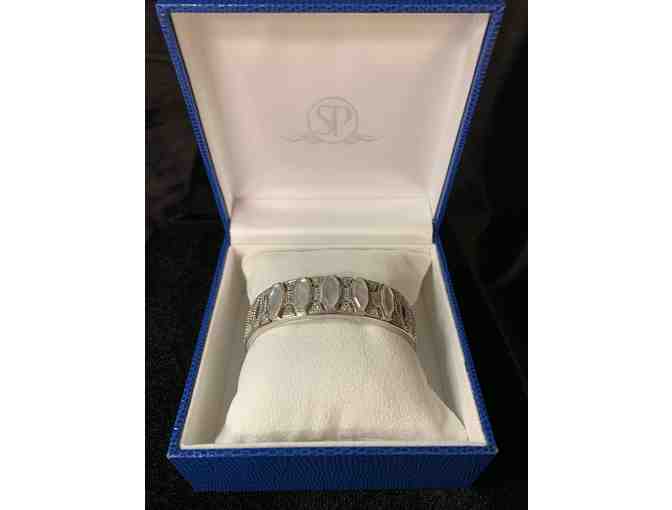 Sterling Silver Modern Deco Cuff with Mother of Pearl Stones and White Sapphires from Sid Potts.